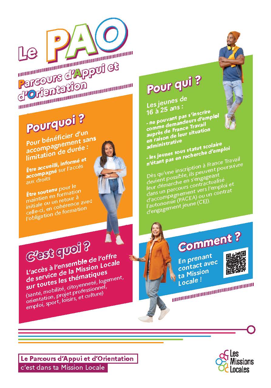 Le Parcours d’Appui et d’Orientation (PAO) est un dispositif mis en place par les Missions Locales pour accompagner les jeunes de 16 à 25 ans qui rencontrent des difficultés d’insertion sociale ou professionnelle.